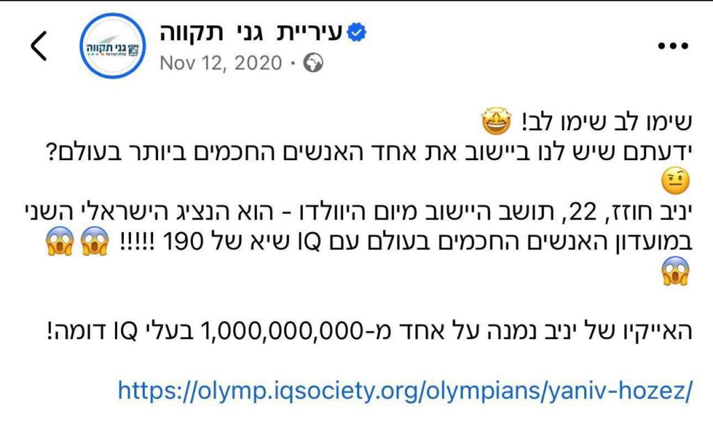 הפוסט נכתב על ידי יניב חוזז. בתאריך ה-12.11.2020 עיריית גני תקווה פרסמה פוסט שמספר שיניב הוא אחד האנשים עם ה-IQ הכי גבוה בעולם, עם נדירות של 1 למיליארד.